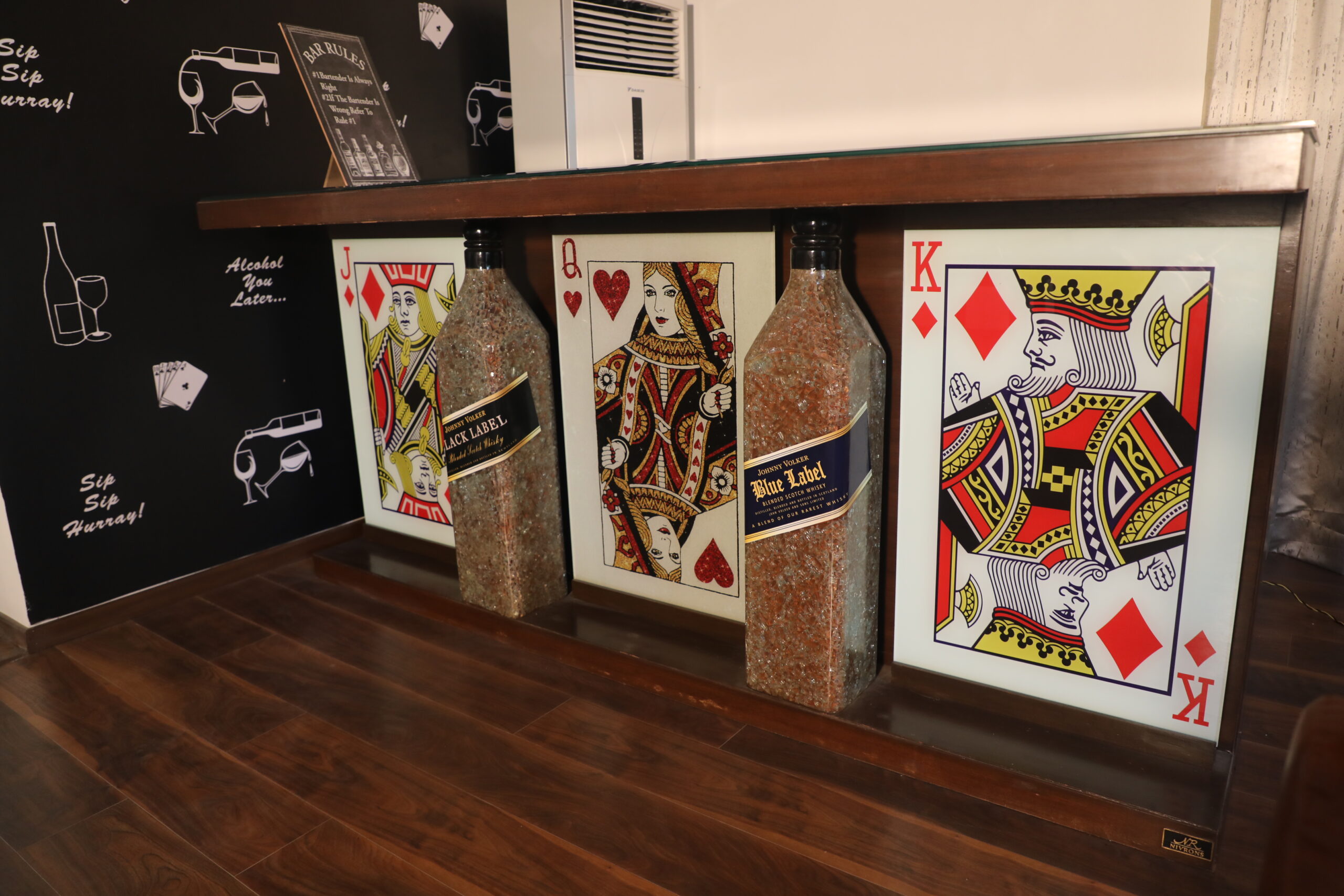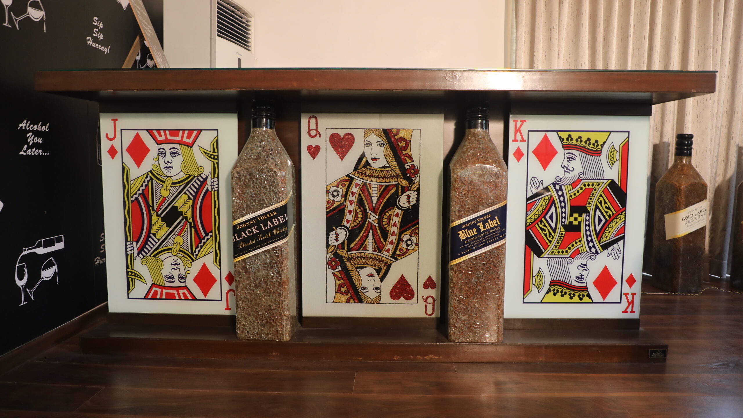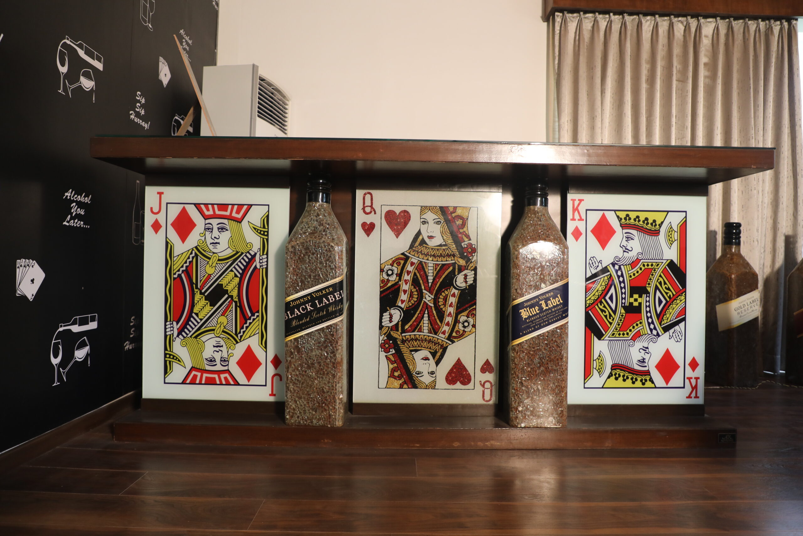 This exclusive collection of bar counter has unreal sized wine bottles. As a surprise element, it will lighten up the vivacious party spirit! The bottles are filled with wine-coloured crystals that resembles the old-time wine that bubbles with energy. The cards are a symbol of how significant and authentic you are for yourself, and the game as well.