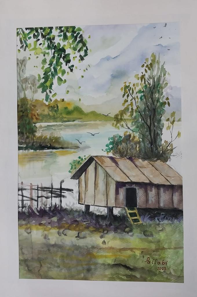 Painted by the gifted hands of Pallabi, a specially challenged child prodigy, “Tranquil Retreat” is a testament to her remarkable talent and boundless imagination. The painting exudes a sense of calmness, with its harmonious blend of soft hues and intricate details. The play of light on the water, the whispering leaves, and the solitude of the hut create an atmosphere of pure serenity, making it a perfect addition to any living space.