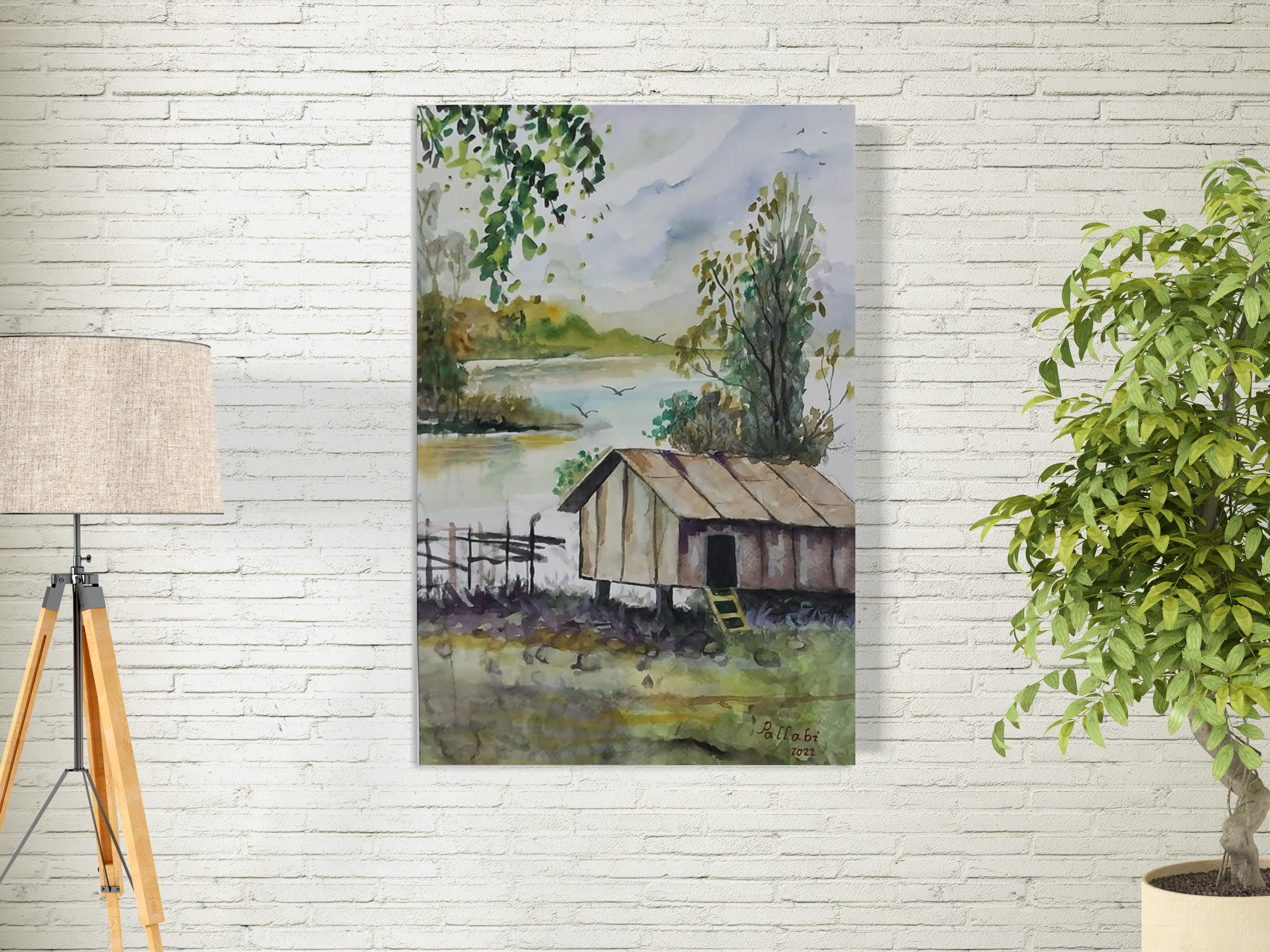 Introducing “Tranquil Retreat” by Pallabi, a mesmerizing wall painting that transports you to a serene lakeside hut nestled in nature’s embrace. This exquisite artwork captures the essence of peace and tranquility, inviting you into a world where the gentle ripples of the lake meet the rustic charm of a secluded hut.